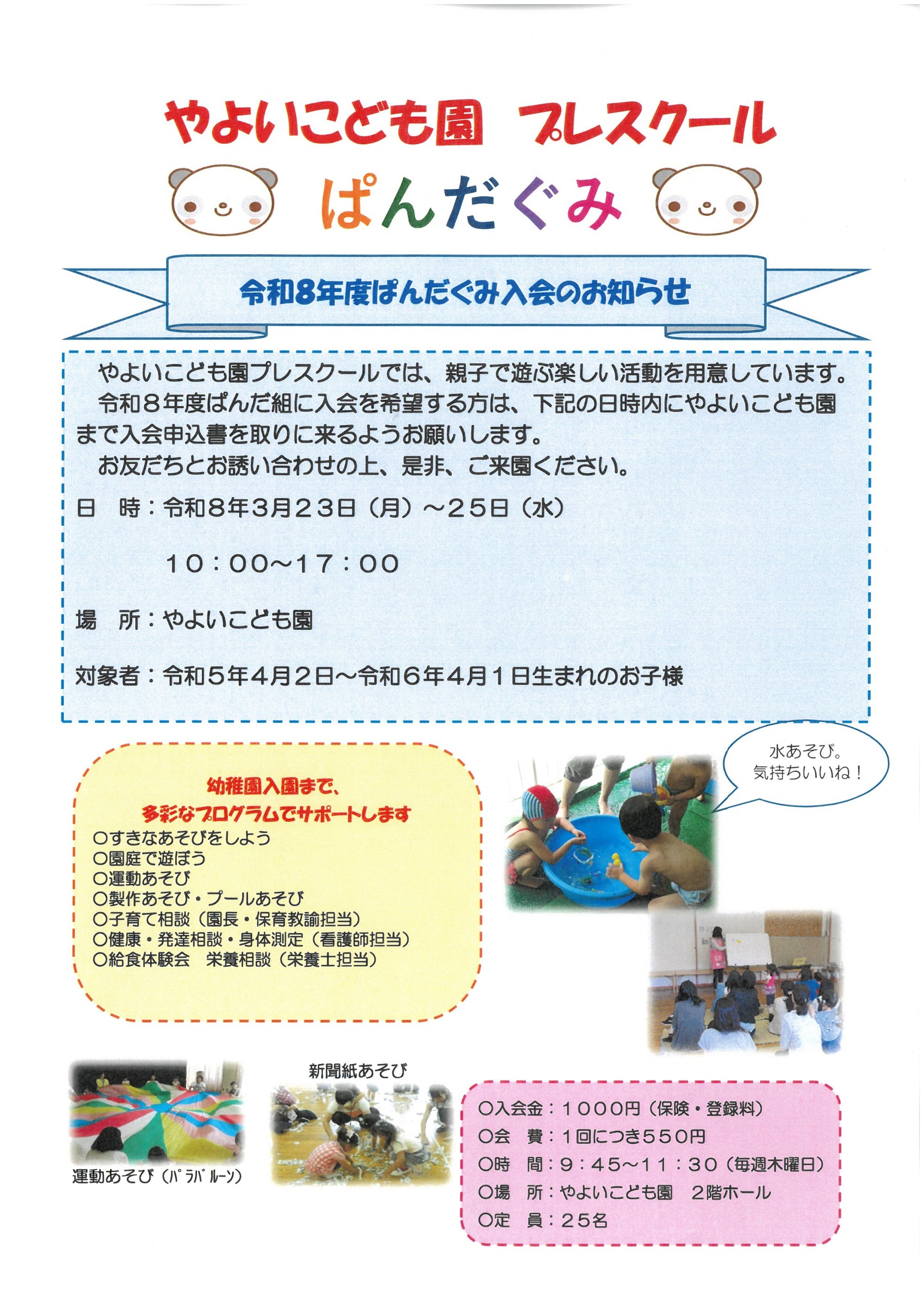 | R7. 11 令和7年度入園(幼稚園コース) 園児(年少児・年中児・年長児)を引き続き募集しています。 ご希望の方は、やよいこども園に電話でお問い合わせください。 03-5358-0901(平日10時~17時の間にお願いします。) |